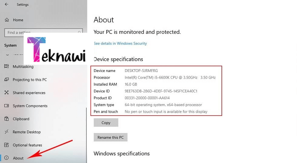 - انقر على “حول” (About): ستجد هذا الخيار في القائمة الجانبية، وسيعرض لك معلومات أساسية عن الجهاز مثل المعالج، الذاكرة، نوع النظام، وإصدار نظام التشغيل.